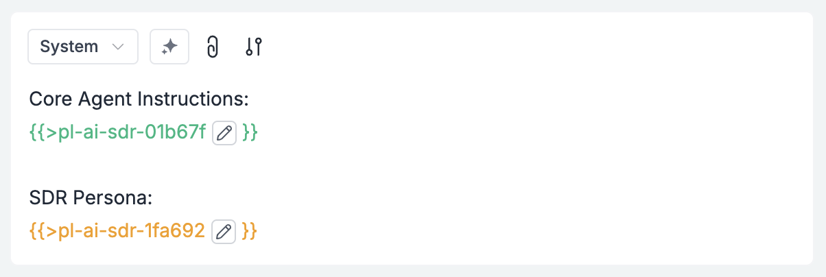 Let’s create reusable components that define our SDR’s core instructions and persona. These are added as Prompt Partials - reusable blocks that can be inserted in any template.