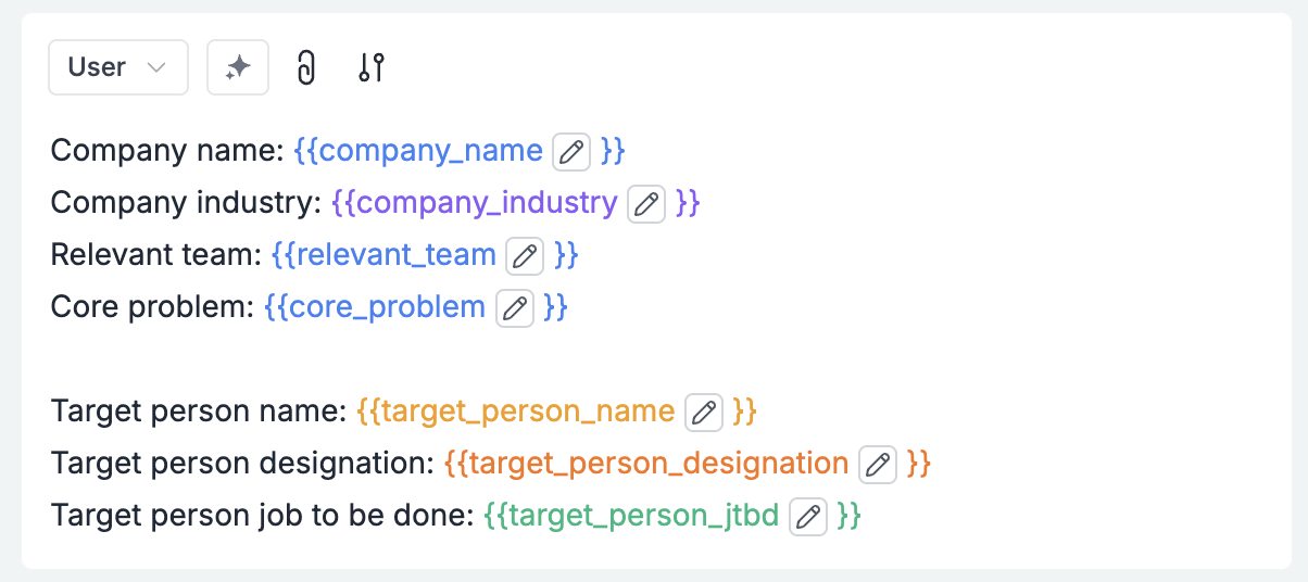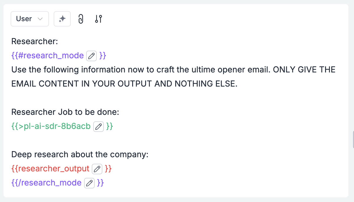 At this stage, we can send a request to the researcher get the research output back.B. Email Drafting Mode (add this section next):Once we have the research output, we can create the first email, and add the following to a new user role in the prompt template: